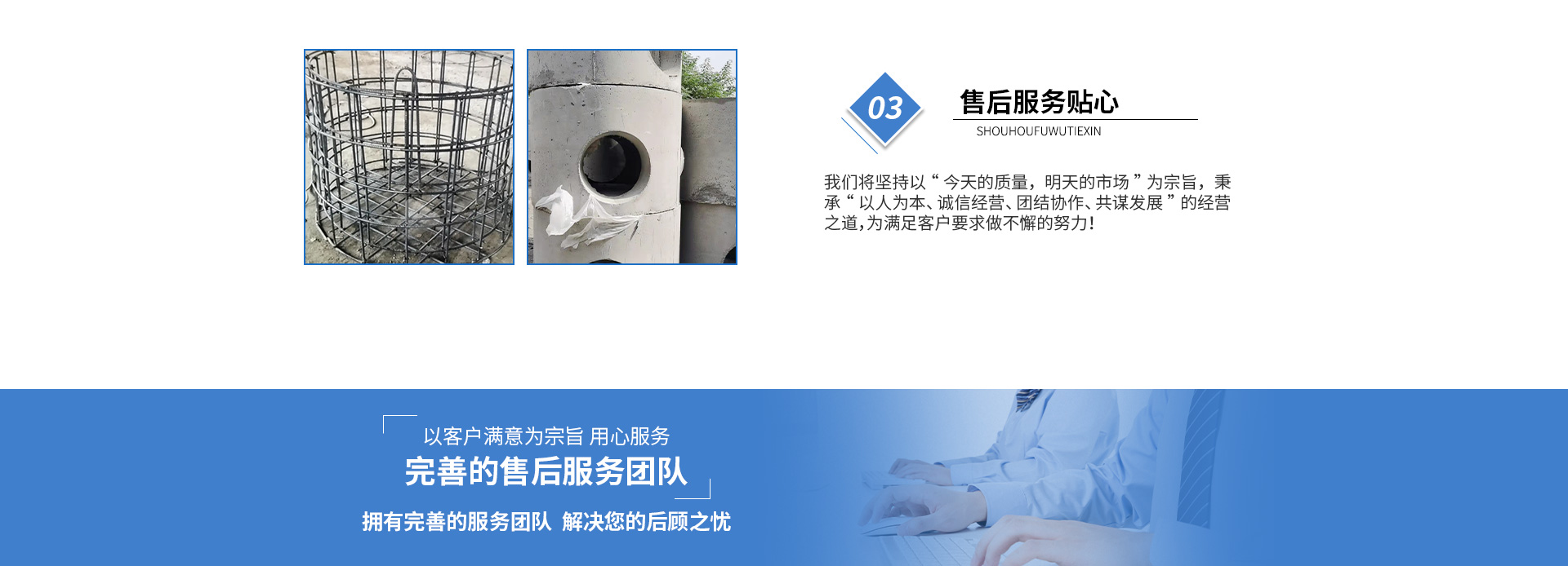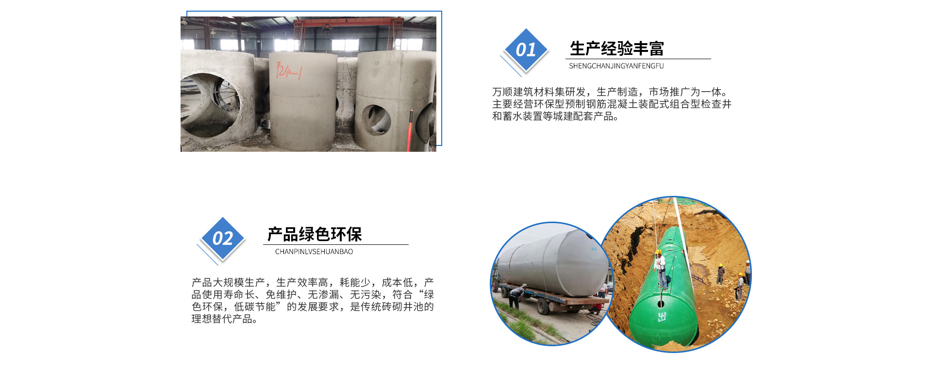 黃山市萬順建筑科技有限公司是集研發(fā),生產(chǎn)制造,市場(chǎng)推廣為一體的綜合性企業(yè)。公司主要經(jīng)營環(huán)保型預(yù)制鋼筋混凝土裝配式組合型檢查井和蓄水裝置等城建配套產(chǎn)品。產(chǎn)品生產(chǎn)過程采用獨(dú)特的生產(chǎn)工藝,機(jī)械化流水作業(yè)。產(chǎn)品大規(guī)模生產(chǎn),生產(chǎn)效率高,耗能少,成本低,產(chǎn)品使用壽命長、免維護(hù)、無滲漏、無污染,符合“綠色環(huán)保,低碳節(jié)能”的發(fā)展要求,是傳統(tǒng)磚砌井池的理想替代產(chǎn)品。